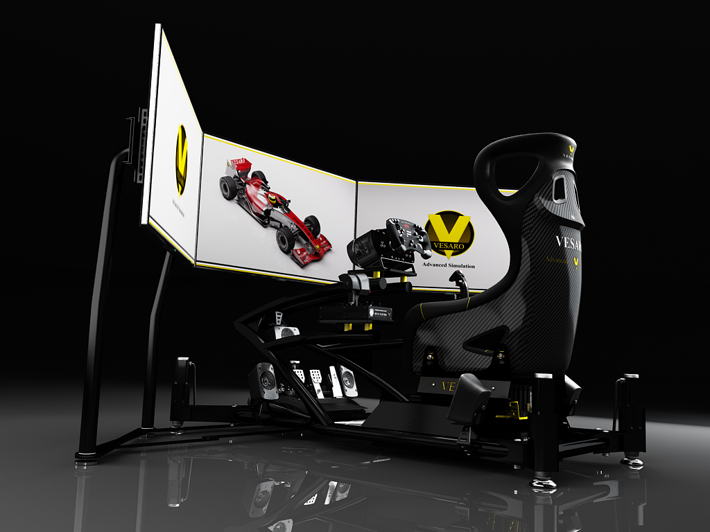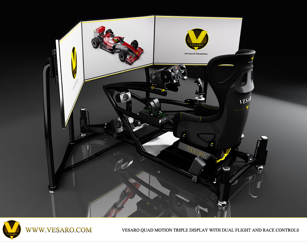 Our new Dual Control setup allows both Flight and Race simulation using the same rig. You can easily reconfigure to a dedicated race or dedicated flight sim as well giving you maximum adaptability. Utilizing Thrustmaster Warthog Flight controls and Fanatec Clubsport control system, shown here is the Clubsport V2 Pedals, EU Base and F1 Rim.